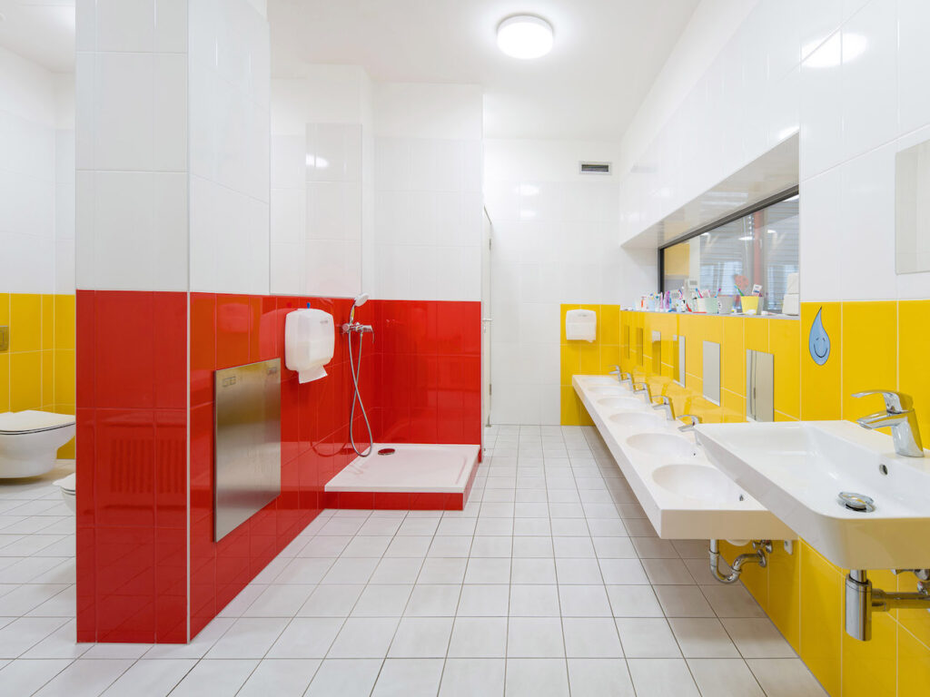 Celkově prostředí školky odpovídá severské filozofii: Je bohaté na podněty, ne však přetížené. V tomto duchu se uplatnily i keramické obklady české značky RAKO, která s YIT dlouhodobě na projektech spolupracuje. Podlahu haly s centrálním schodištěm i samotné nášlapy schodů tvoří neglazované slinuté dlaždice RAKO v designu hrubozrnného betonu a cementu ze série Piazzetta v odstínu světle šedé. Stěny umývárny a sociálních zařízení pokrývají keramické obkládačky Color One. Jsou v zelené, modré, žluté a červené barvě, čímž odkazují na barvy v přírodě, mech v lese, vodu, slunce, květiny. Jinde je bíle obložená stěna vtipně doplněná barevnými variantami tvořícími pruhy. Na podlahách se uplatnily dlaždice série Color Two.
