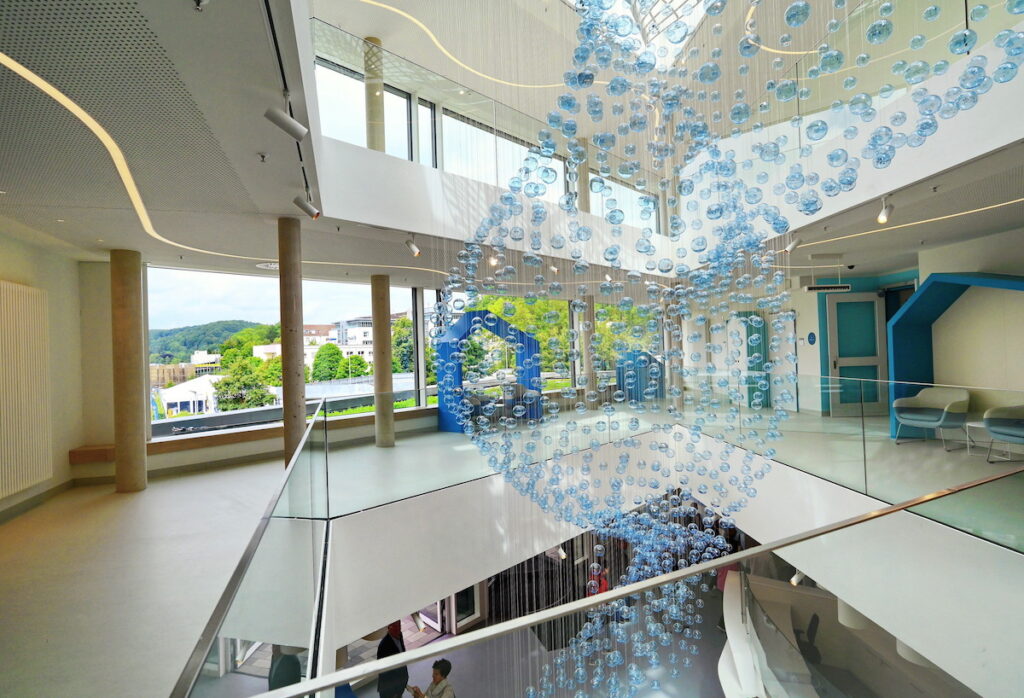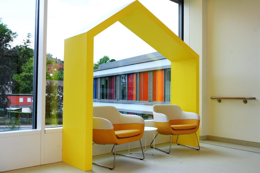 To je hlavní myšlenka, která se jako barevná nit táhne návrhem, s nímž berlínská architektonická kancelář Hascher Jehle Architekur zvítězila v soutěži. Středobodem všeho, lékařů i architektů, je tady dítě. Uvnitř budovy se za duhově zbarvenou fasádou nachází námořní svět s recepcí připomínající příď lodi. Plovoucí stropní instalace vyrobená z 3500 poloprůhledných skleněných koulí se klene nad vstupním prostorem a propojuje tři podlaží dohromady v zakřiveném tvaru, který dosahuje až ke skleněnému stropu. Instalaci vytvořili designéři Heike Weber a Walter Eul, koule však vybarvily fixy dětí z bielefeldských škol na dvoudenním workshopu na fotbalovém stadionu Schüco Arena. Každá skleněná koule je tedy sama o sobě uměleckým dílem – navrženým dětmi pro děti a dohromady tvoří jednu velkou uměleckou kompozici.
