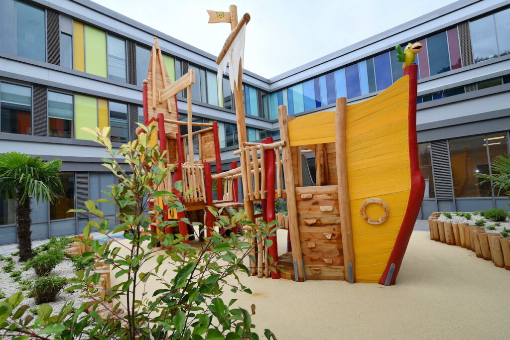 V centrální části přízemí reagují na pohyb obrazy ryb promítané na podlahu, vlny dělá imaginární voda. Místo architekti záměrně navrhli tak, aby podporovalo setkávání a komunikaci. Oproti tomu jsou zde i oázy v uklidňujících barvách a v měřítku vhodném pro děti. V komplexu budov o rozloze 15.000 m² pomáhají s orientací stěny zdobené zvířaty. Po obvyklé nemocniční atmosféře zde není ani stopy. Protože, jak se klienti, architekti, lékaři a rodiče shodují: Pocit pohody je klíčovým faktorem v procesu uzdravení.