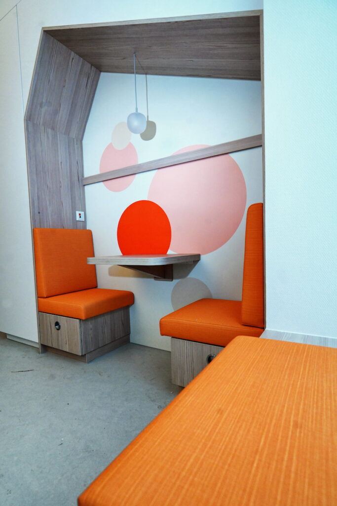 Místa pro děti: Kromě hracích koutků a nabídky digitální zábavy jsou na každém patře pro děti a rodiče k dispozici krytá útočiště v uklidňujících barvách. Fotograf: Barbara Franke