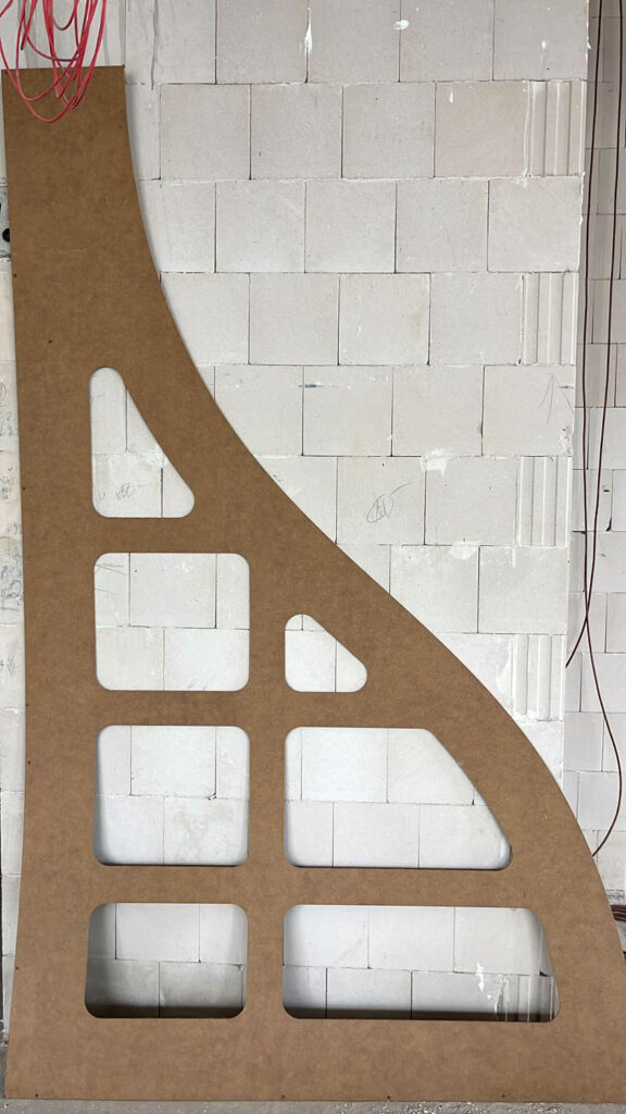 Postup prací při realizaci motivu flašky na fasádě (CNC vyřezaná šablona z překližky – seskládání vzoru 1: 1 na podlaze – realizace z lešení) Foto: Ing. Tomáš Macháček z firmy MC Stone