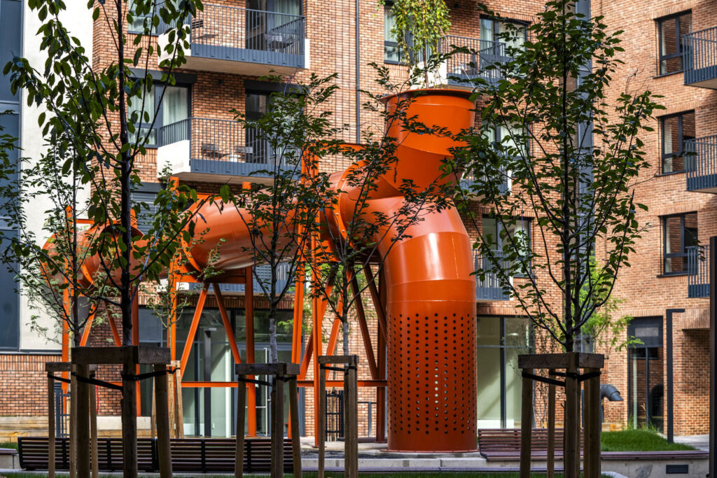 Ve vnitrobloku je nejvíce viditelným prvkem produktovodová brána. tvoří ji velkoformátové potrubí, které má na jedné straně vyřezané otvory pro květiny a na straně druhé otevřenou kalhotu, ve které je ve výšce vysazena bříza. Socha torza konstrukcí společně s materiálovou mozaikou parteru nabízí neokoukaný prostor vnitrobloku, který poutá pozornost pohledů nejen ze všech bytů.