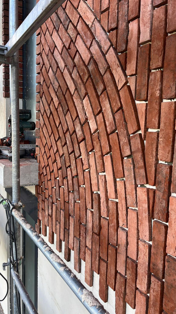Fasády jsou tvořeny pestrou škálou povrchových úprav a jejich kombinací, především ale cihelnými obkladovými pásky. po několika fázích vzorování byly vybrány dva odstíny cihlových obkladů terca výrobce Wienerberger v atypickém formátu s tloušťkou 18 mm z důvodu snížení zatížení systému ETICS. jedná se o cihlové obkladové pásky Terca OPUS a Terca Pastorale ve formátu 216 × 65 mm, které jsou použité v kombinaci se spárovací hmotou v barvě přírodní bílá a antracitová. Na části fasády byly dále použity tmavé obkladové pásky Terca Agora grafietzwaart. Cihelný obklad realizovala společnost MC Stone.