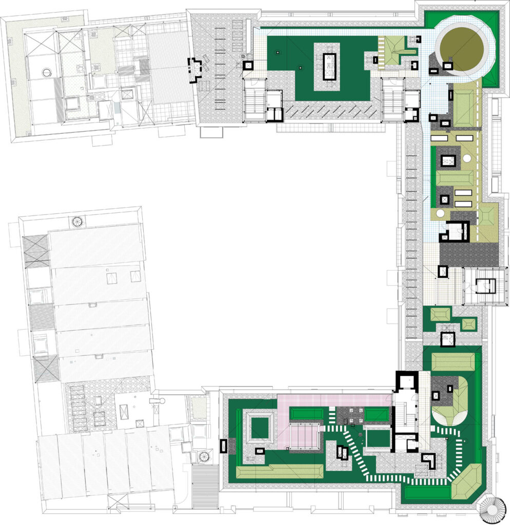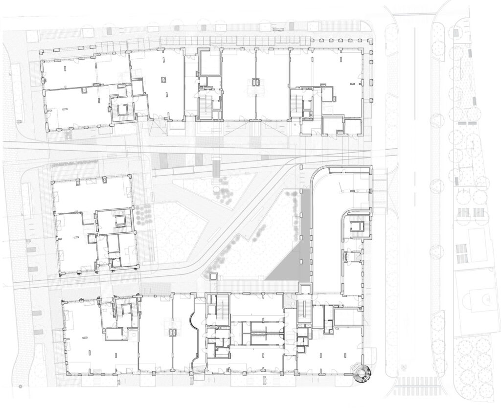 Partery budou netradičně protkány konstrukcemi industriálních produktovodů s vyrůstající zelení. Povrchy tvoří kombinace nových i starých materiálů, dlažby kovové konstrukce, potrubí, zbytky strojů nádob a podobně. Vše, co se povedlo zachovat z původního areálu, bude uplatněno v novém areálu jako odkaz na původní účel území.