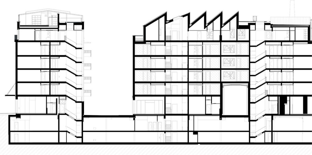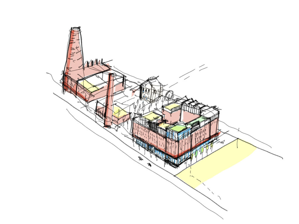 Celý areál je vnímán jako jedna velká továrna. A správná archetypální továrna má mít cihelné fasády, komín a okna s průmyslovým členěním. to je dobře vidět na koncepční skice od Tomáše Císaře, kterou jsme prezentovali společně s návrhem v CAMpu v roce 2018. původně jsme počítali s větším spektrem cihelných formátů, druhů povrchů, barevností či způsobu kladení cihel. Tam jsme ale narazili na technologické možnosti realizace, například u vytváření abstraktních cihelných tvarů na fasádě pomocí robotů nebo atypických cihelných tvarovek. Projekt jsme proto více zracionalizovali a uvedli do současné podoby, která se od aktualizovaných renderů již tolik neliší.