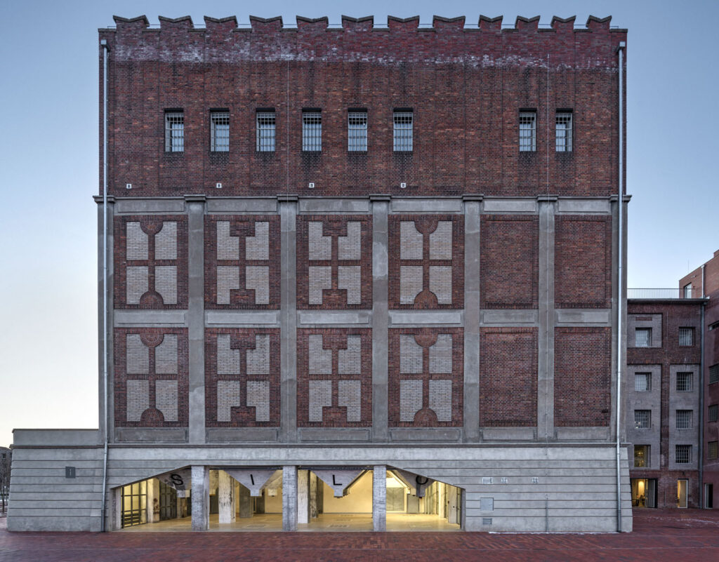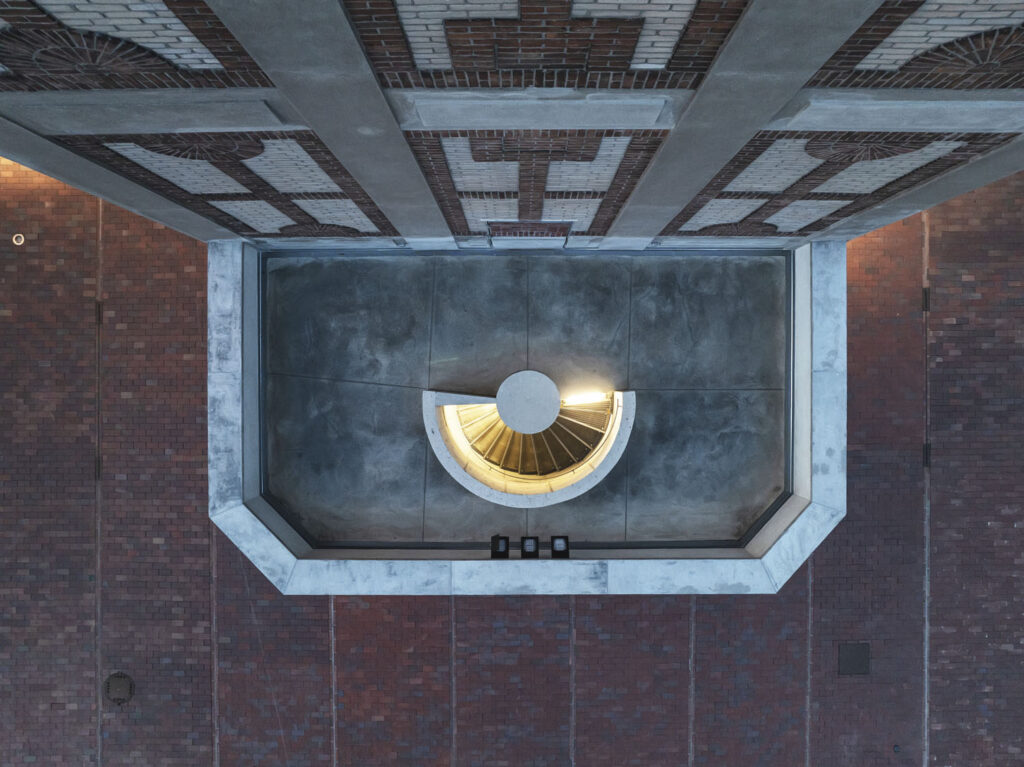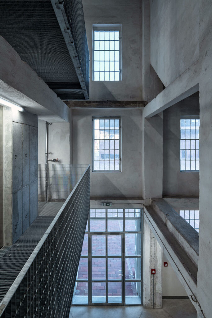 „Úvahy o hlavním vstupu nás nakonec vedly k rozhodnutí aktivovat parter. Sokl jsme otevřeli novým otvorem s náběhy, odkrývá tak sochařskou kvalitu interiérů. Otvor je formován podobně jako celý sokl – má tvar nosníkové formy, která evokuje únosnost a je všeobecně čitelná, stejně jako masivnost podnože. Sokl i otvor v něm mají pocitově nést tíhu zásobníků nad nimi. Zjednodušeně lze říci, že jsme chtěli dům rozvinout v jeho racionalitě i monumentalitě,“ říká architekt Marek Přikryl a dodává: „Interiéry zůstaly ve formě i výrazu civilní, bez nadbytečného designu. Barvy a cihly jsme ponechali fasádám, vnitřek je barevně tlumený, se světlou omítkou v kombinaci s přiznaným betonovým skeletem se všemi jeho nedokonalostmi. Rejstřík materiálů je standardní, stavařský – beton, omítky, dlažba, pozink, luxfery – šli jsme cestou nekontrastního doplňování starého. Tam, kde to bylo možné, povrchy betonů a omítek zůstaly v původním stavu včetně patiny.“