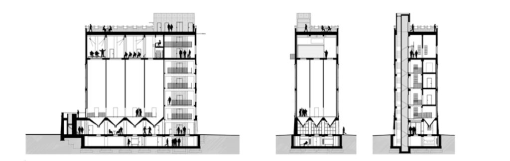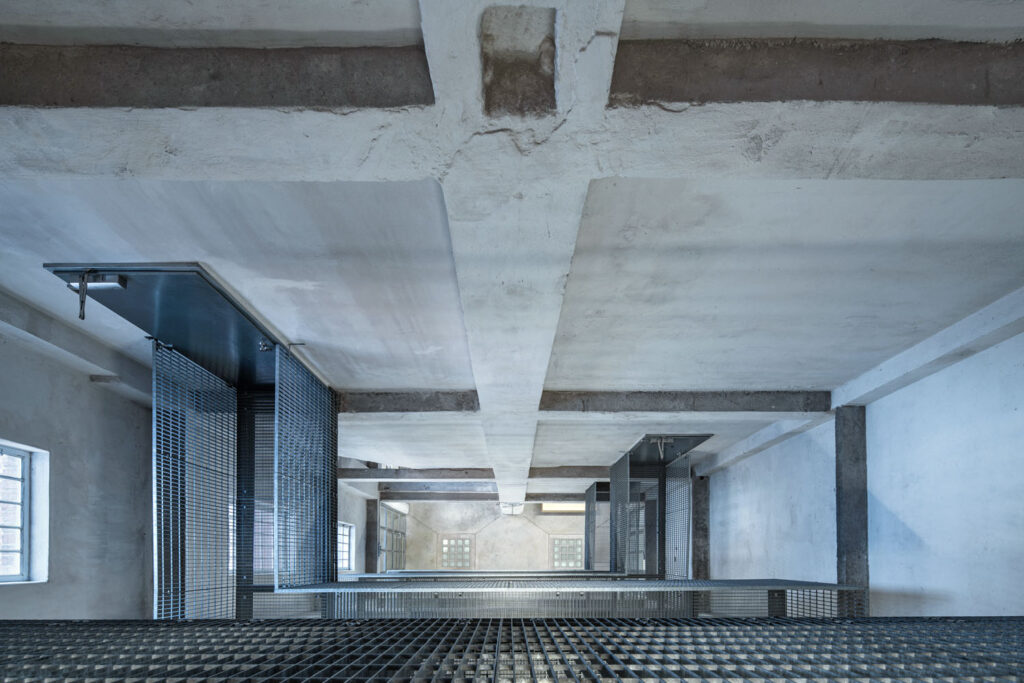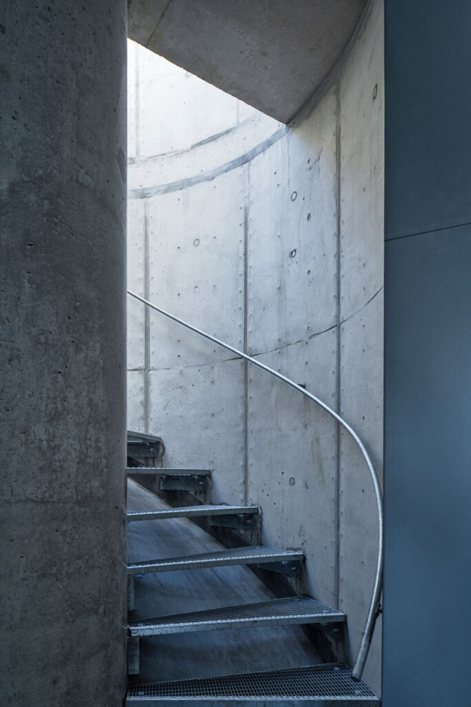 Schodiště a výtah: Z traktu čistírny a třídírny zůstaly železobetonové konstrukce a omítané vyzdívky. Do prostorové hry trámů, věnců a zavěšených zásobníků autoři vložili schodišťovou věž s výtahem. střední pole ponechali přes šest pater volné až do stropu sálu.