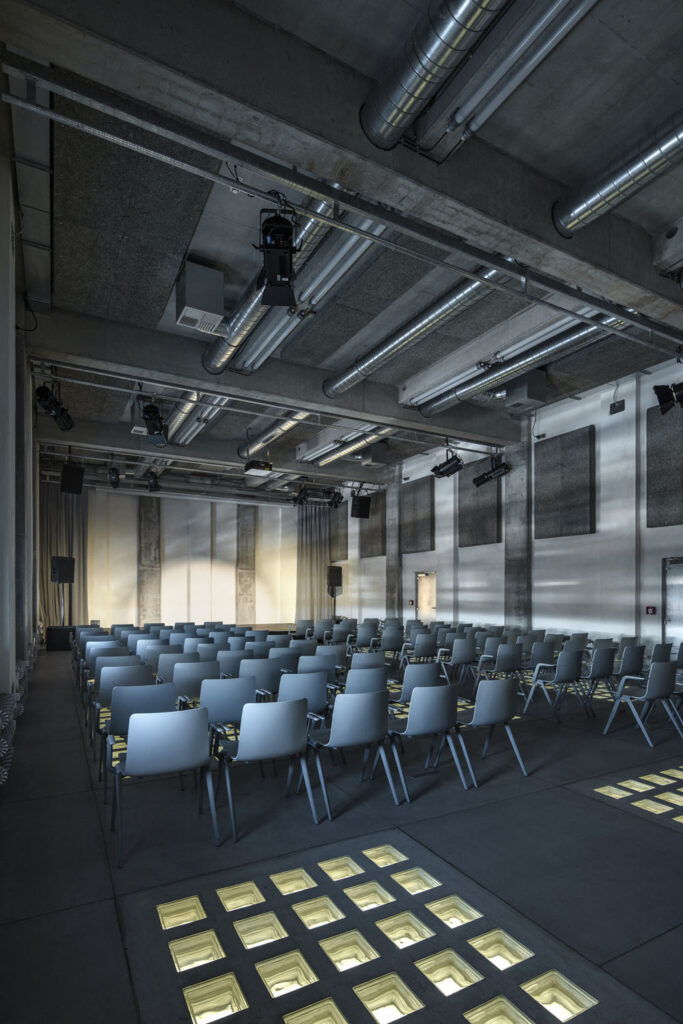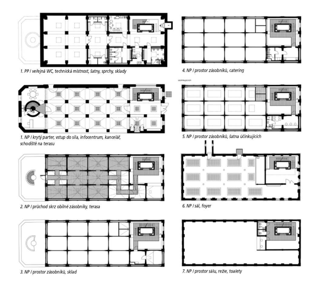 Sál: Do technologického patra v šestém podlaží je vložen víceúčelový sál. Jeho půdorys kopíruje rozložení zásobníků včetně výběžku nad dvěma aty- pickými zásobníky a vestavbou. Předprostor tvoří mezistupeň mezi foyer a sálem. V úrovni 7. NP je místnost režie a sklad vybavení sálu.