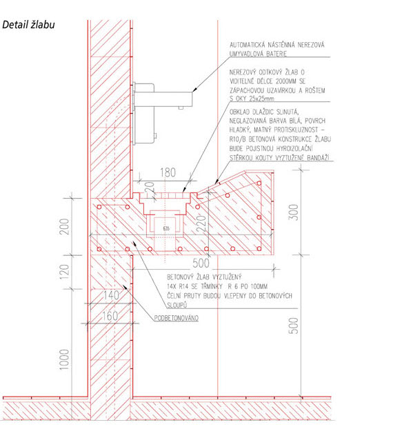 V místech, kde byla odstraněna část obvodové stěny parteru pro nový vstup, jsou šikmé stěny, zavěšené na podhled obvodového průvlaku a kotvené do sloupů. Jejich betonáž probíhala vtlačováním samozhutnitelného betonu do svislé stěny bednění.