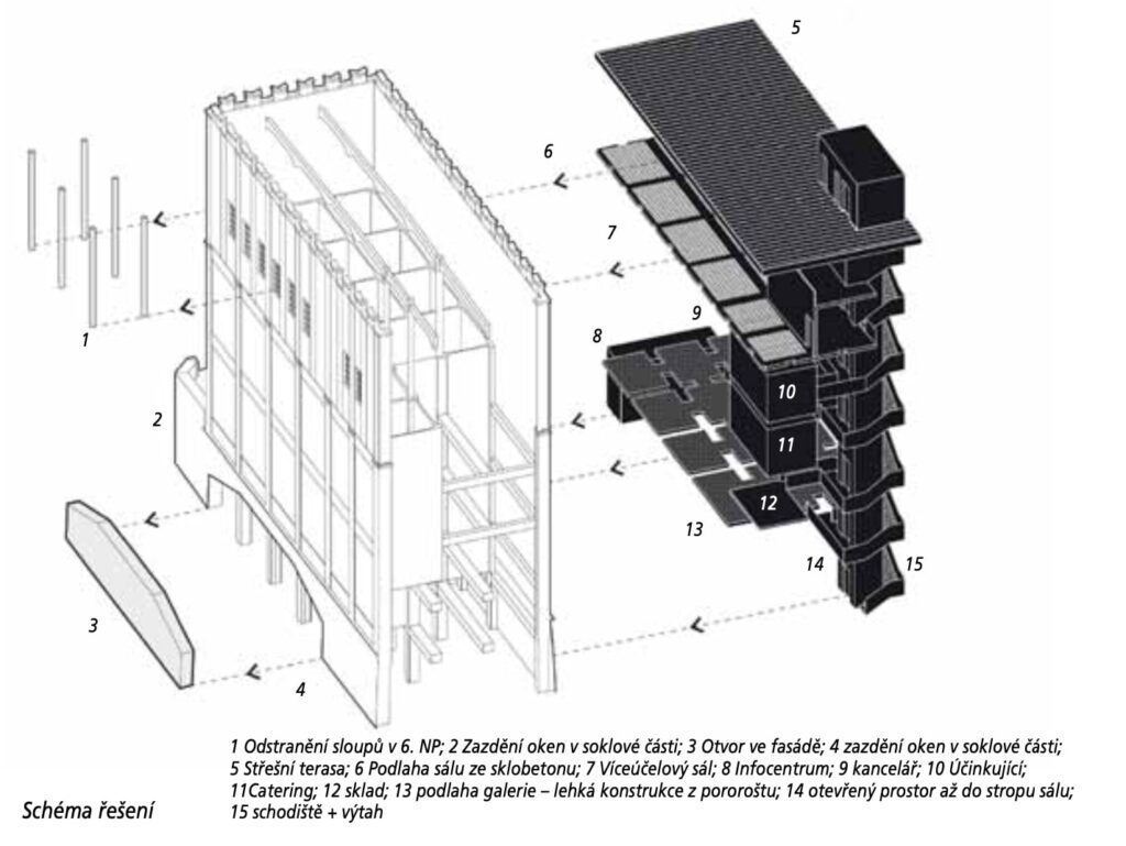 Pro nový sál se v 6. a 7. NP odstranily stropy nad buňkami sila, sloupy, střešní desky včetně trámů a atika. Z původní konstrukce tak zůstalo pouze obvodové zdivo.