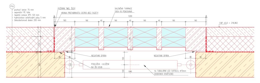 Sklobetonový prefabrikovaný panel v 1. NP: vodorovná nosná konstrukce ze skleněných tvárnic osazených v žebrové betonové stropní konstrukci s požárnědělicí funkcí. Rozměry 1200/1200 mm, tl. 190 mm. Okrajový betonový pás má šířku 160 a tloušťku 190 mm po celém obvodu. Betonová žebra mezi tvárnicemi mají šířku 40 a výšku 180 mm. Luxfery jsou pískované o rozměrech 190/190 mm, tl. 160 mm