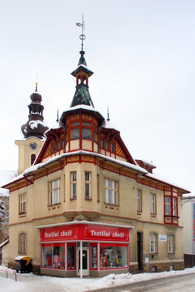 Díky své poloze v bezprostřední blízkosti hlavního náměstí a kostela Všech svatých patřila ulice Nádražní vždy k těm frekventovanějším, v minulosti tudy proudily davy lázeňských hostů. Někdejší dřevěnici z 19. století na rohu náměstí nahradila v roce 1910 zděná stavba v secesním stylu, kterou si nechala postavit rodina pozdějšího starosty Jindřicha Chumchala, stavbu  realizovali místní stavitelé Barabáš a Bajer. Přízemí bylo koncipováno pro obchodní a dílenský (textilní) provoz, patro sloužilo k bydlení. Vila měla tradiční totalitní osud – konfiskaci a následné vrácení v restituci potomkům ve stavu vyžadujícím nákladnou rekonstrukci…