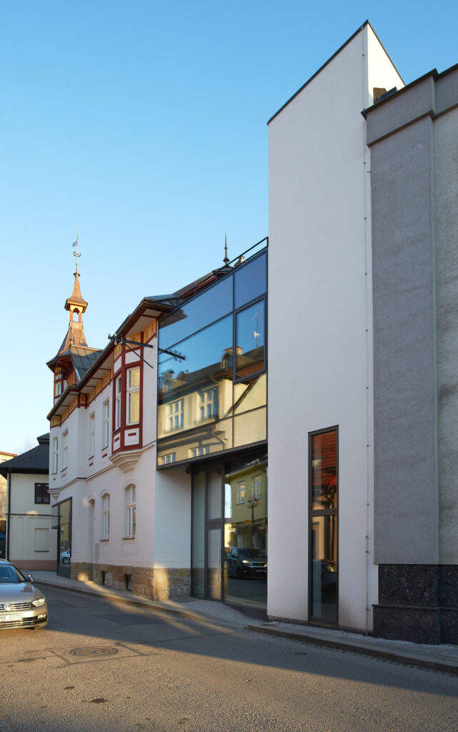Navzdory stoletému věkovému rozdílu mezi architekturou původního objektu a architekturou přístavby, působí toto „setkání historického a novodobého“ harmonicky. Minulost a současnost se prolíná přirozeně, a to zásluhou ideové linky i použitých materiálů, mj. i hliníkových systémů Schüco, které obnovily výkladní skříň v původním objektu a zároveň vytvořily prosklenou fasádu novostavby.