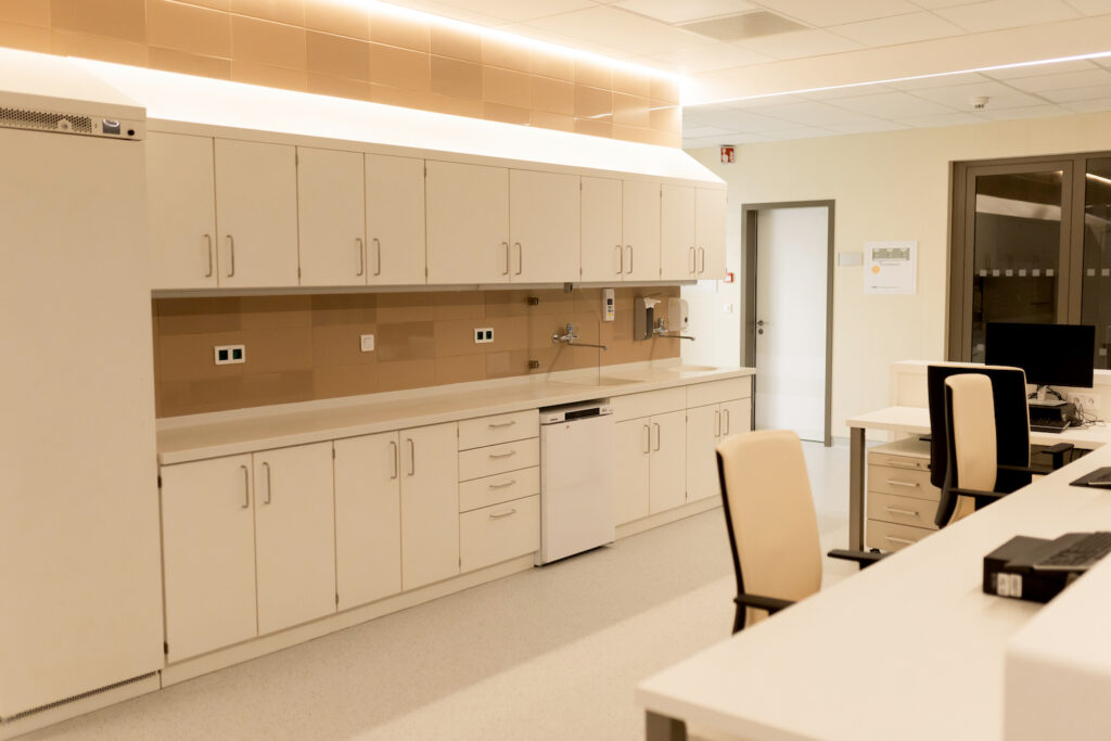 Dalším ze základních požadavků je bezpečnost, tedy protiskluznost podlah. Ta je v zaměstnanecké části pavilonu zajištěna dle norem na úrovni R10/B v podobě béžových dlaždic formátu 60 x 60 cm série Extra od RAKO. „Extra nabízí povrch s protiskluzností R10/B, který je zároveň dobře čistitelný. Velkoformátové řešení 60 x 60 cm pak vychází vstříc požadavkům hygieny na minimalizaci spár podlahy, ve kterých se drží nečistoty, hůře se udržují a dezinfikují,“ podotýká Martin Franěk. Sérii Extra doplnil na stěnách v zázemí zaměstnanců a běžné veřejnosti obklad ze série Rebel.