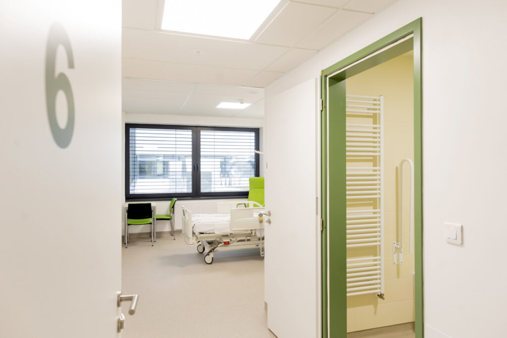 Koupelny v pokojích mají vždy tři stěny obložené světle béžovým keramickým obkladem a jedna stěna reflektuje barvu patra. Aby plocha nepůsobila jednotvárně, střídají se zde obkládačky s lesklým a matným povrchem. „Lesk a mat tvoří při pohledu pod určitým úhlem dekor, na stěně se něco děje. Toto oživení je zajímavé, ale není obtěžující,“ vysvětluje architekt. Celkem se v pokojích pacientů uplatnilo na 4700 m2 obkládaček od RAKO, najdeme je i v úklidových a čisticích místnostech na všech patrech.