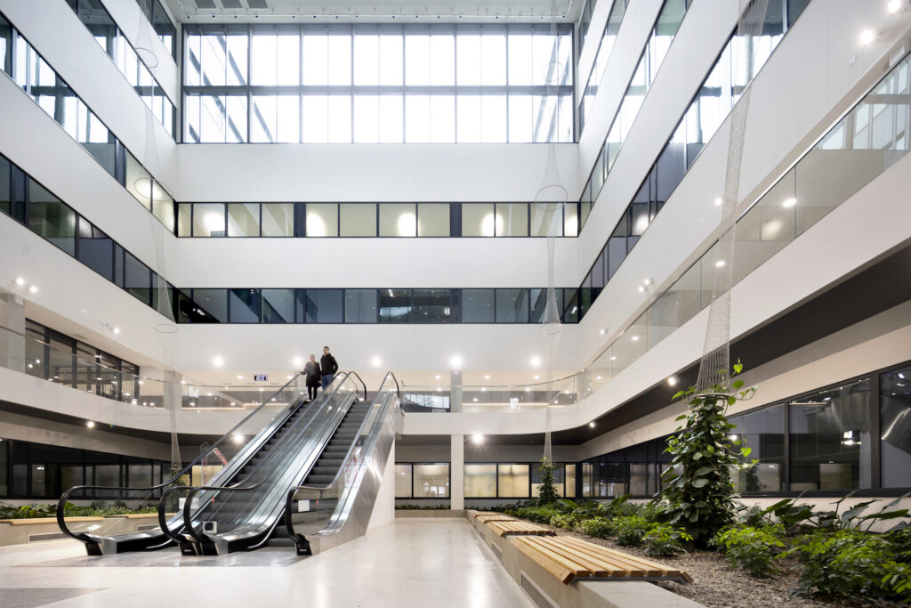 Zatímco Pardubická nemocnice je spíše pavilonového typu, nový objekt směřuje k centralizaci některých provozů. „Vnitřní atrium obklopují v patrech jednotlivá oddělení. Výsledná stavba je kompaktní, což je výhodné např. z hlediska energetiky,“ vysvětluje architekt Franěk.