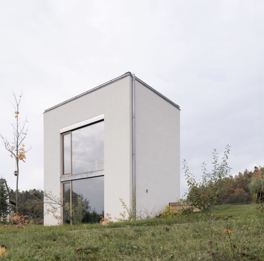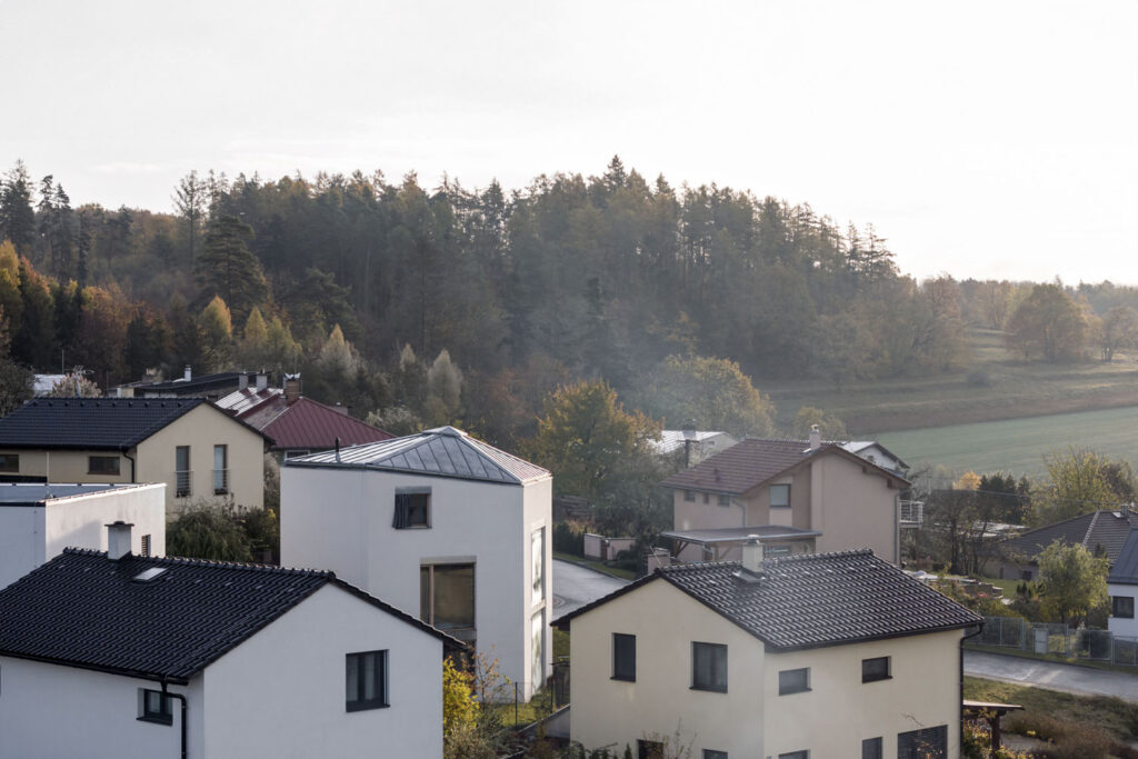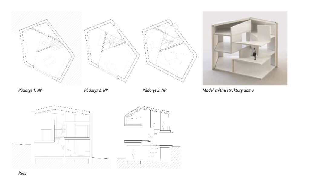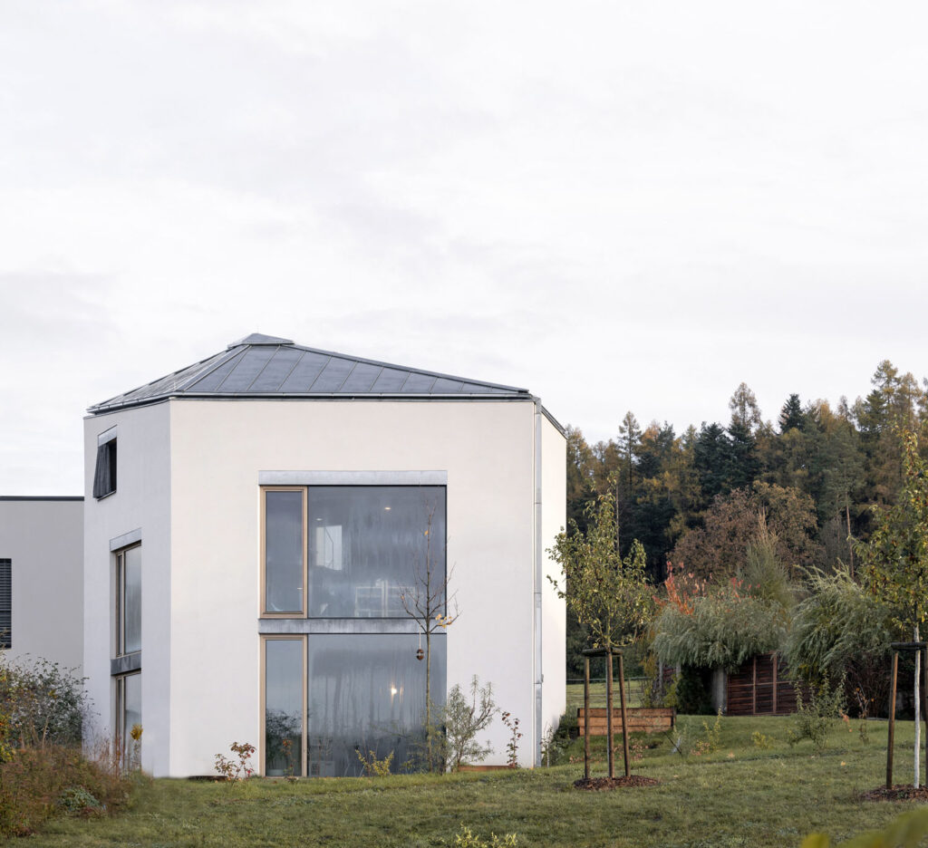 Investoři měli k dispozici malý pozemek uprostřed novodobé venkovské zástavby. Chtěli rodinný dům, který pojme všechny potřebné místnosti, přáli si ponechat i kousek zahrady. Autoři projektu to vyřešili návrhem, který je založen na vertikalitě. Půdorys vychází z topografie a výhledů do krajiny, takže má tvar nepravidelného pětiúhelníku. Dům korunuje asymetrická stanová střecha – poměrně střízlivým fasádám s velkými okny přidává hravý prvek, jakousi čepici posunutou do týla.