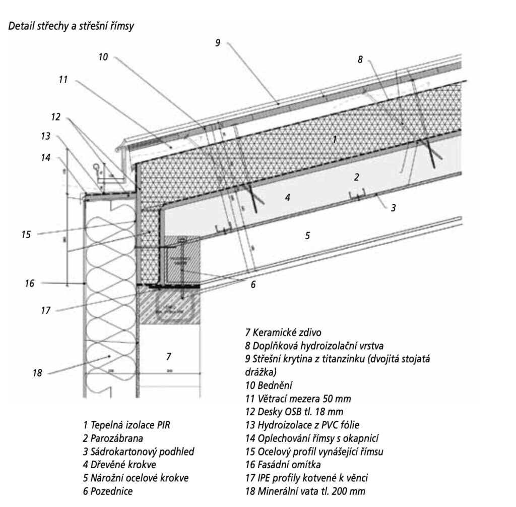 Na krokve se pokládalo bednění z OSB desek na pero a drážku a parozábrana z asfaltových pásů i jako provizorní hydroizolační vrstva. Následuje nadkrokevní tepelná izolace PIR tloušťky 180 mm a doplňková hydroizolační vrstva. Kontralatě se kotvily skrze nadkrokevní tepelnou izolaci do dřevěných krokví pomocí vrutů. Prostor mezi kontralatěmi slouží k odvětrání střechy. Na kontralatě je přibito bednění, které vynáší titanzinkovaný falcovaný střešní plášť. Uzavírací vrstvu spodní části střešní skladby tvoří sádrokartonový podhled.