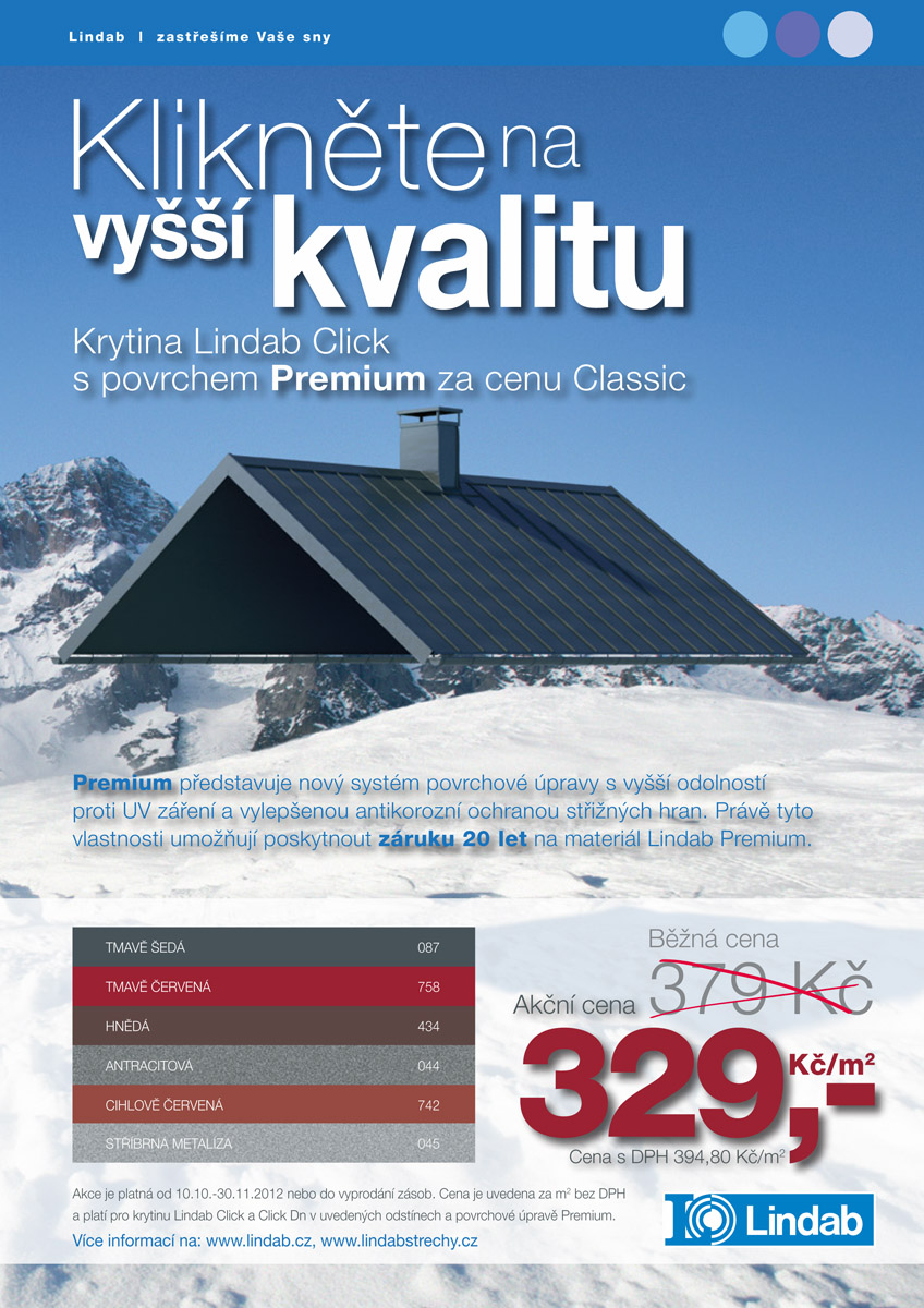 Společnost Lindab připravila slevovou akci na bezúdržbovou stavebnicovou krytinu Lindab Click se zámkovým spojem. V období od 10. 10. do 30. 11. 2012 můžete získat za cenu základního Classicu pokročilý antikorozní povrchový systém Premium se zárukou 20 let. Místo 379 Kč tak zaplatíte 329 Kč/m² bez DPH. Sleva se vztahuje na šest nejoblíbenějších odstínů – tmavě a cihlově červenou, tmavě šedou, hnědou, antracitovou a stříbrnou metalízu.