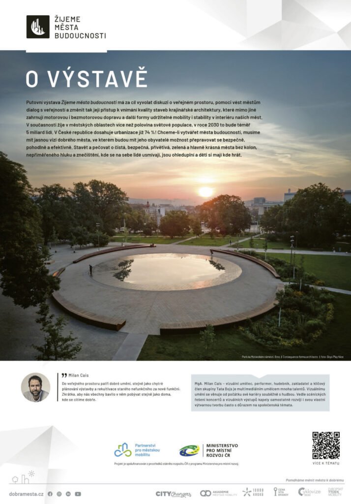 Výstava Žijeme města budoucnosti se věnuje důležitému tématu veřejného prostoru a představuje odvážné projekty upozorňující na fakt, že veřejný prostor je jen jeden a my se musíme rozhodnout, zda dáme přednost dalším parkovacím místům, dětským hřištím, krajinným úpravám nebo vodním prvkům. Výstava přináší rovněž dobrou zprávu, že lidé po celém Česku o podobných koncepcích už uvažují.