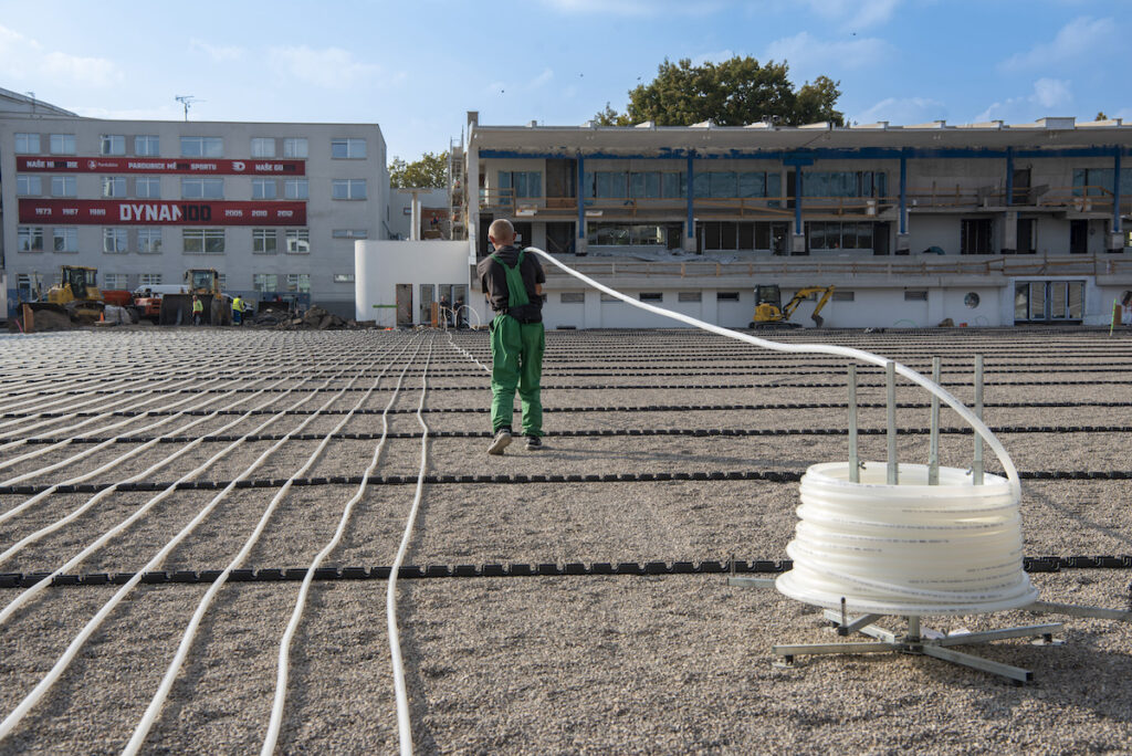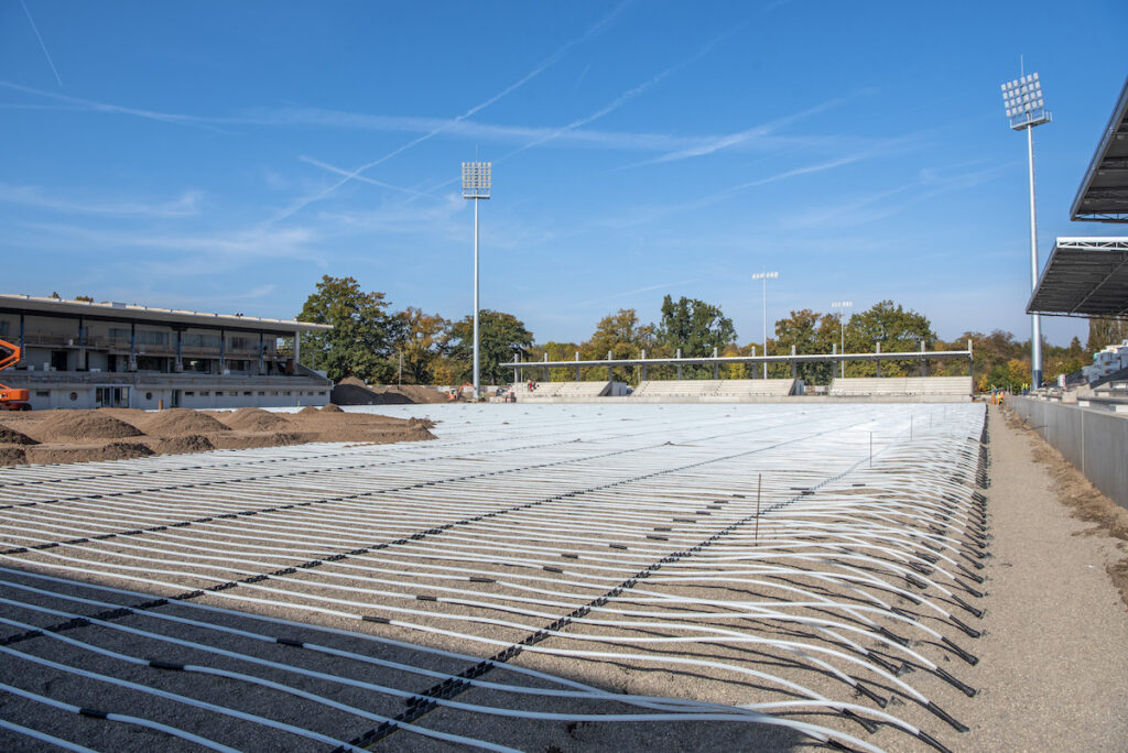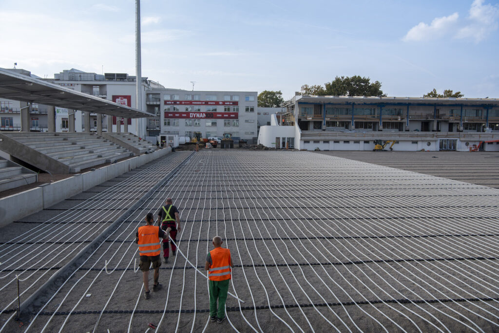 Z hlediska funkčnosti potřebuje v kritickém zimním období fotbalové hřiště topný výkon 1,2 megawatty pro to, aby došlo k roztávání sněhu. Při běžném temperování hrací plochy je zapotřebí zhruba polovička – tzn. cca 600 kW. Zdroj tepla je různý. V mnoha případech se jedná o centrální teplárny, jindy se využívá odpadního teplo, někde je k dispozici plynový kotel. Záleží vždy na konkrétní lokalitě a na vlastníku stadionu. Bylo vysledováno, že v průměru se náklady na vyhřívání stadionu pro jednu sezonu pohybují okolo 700 tisíc Kč až jednoho milionu Kč (měření z roku 2021). V roce 2023 byl postaven nový stadion v Pardubicích. Technologii vyhřívání podle podkladů a zkušeností REHAU projektovala firma Snow Plan Liberec a realizaci povrchu provedla firma Delmonte Bauinvest s.r.o. Na tomto konkrétním hřišti bylo položeno 29 kilometrů potrubí REHAU RAUTHERM o průměru 25 x 2,3 mm. Jednotlivé topné smyčky jsou propojeny v systému Tichelmann, což znamená, že smyčka, která má nejkratší přívod, má také delší zpátečku, čímž jsou zabezpečeny identické hydraulické poměry ve všech smyčkách. Potrubí je uloženo v hloubce 25 až 30 cm s roztečí cca 30 cm. Potrubí je vyrobeno z vysoce odolného high-tech materiálu, kterým je síťovaný polyethylen (PE-Xa). Celý systém je napuštěn odbouratelnou nemrznoucí kapalinou (obvyklá teplota u plného výklonu je 50 °C). Systém vytápění hrací plochy je řízen s pomocí originálního softwaru REHAU s inteligentní regulací. Zdrojem energie je v Pardubicích ekologický teplovod z Elektrárny Opatovice.