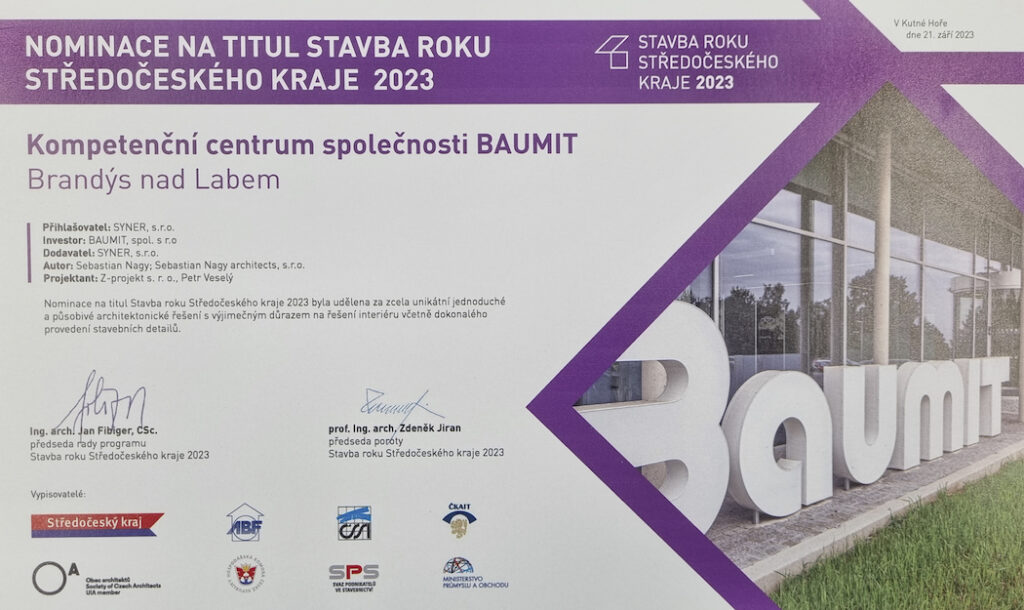 Kompetenční centrum společnosti Baumit, slavnostně otevřené v loňském roce v Brandýse nad Labem, proměnilo první ze dvou nominací v prestižní soutěži Stavba roku, pořádané Nadací pro rozvoj architektury a stavitelství. Ve čtvrtek 21. 9. převzal zástupce společnosti Baumit v Galerii Středočeského kraje Zvláštní cenu svazu podnikatelů ve stavebnictví, která se uděluje výjimečně pojatým sídlům společnosti. Oceněná budova Kompetenčního centra stále ještě zůstává ve hře o titul Stavba roku 2023. Hlasování o postup do finále soutěže potrvá do 23. listopadu 2023.