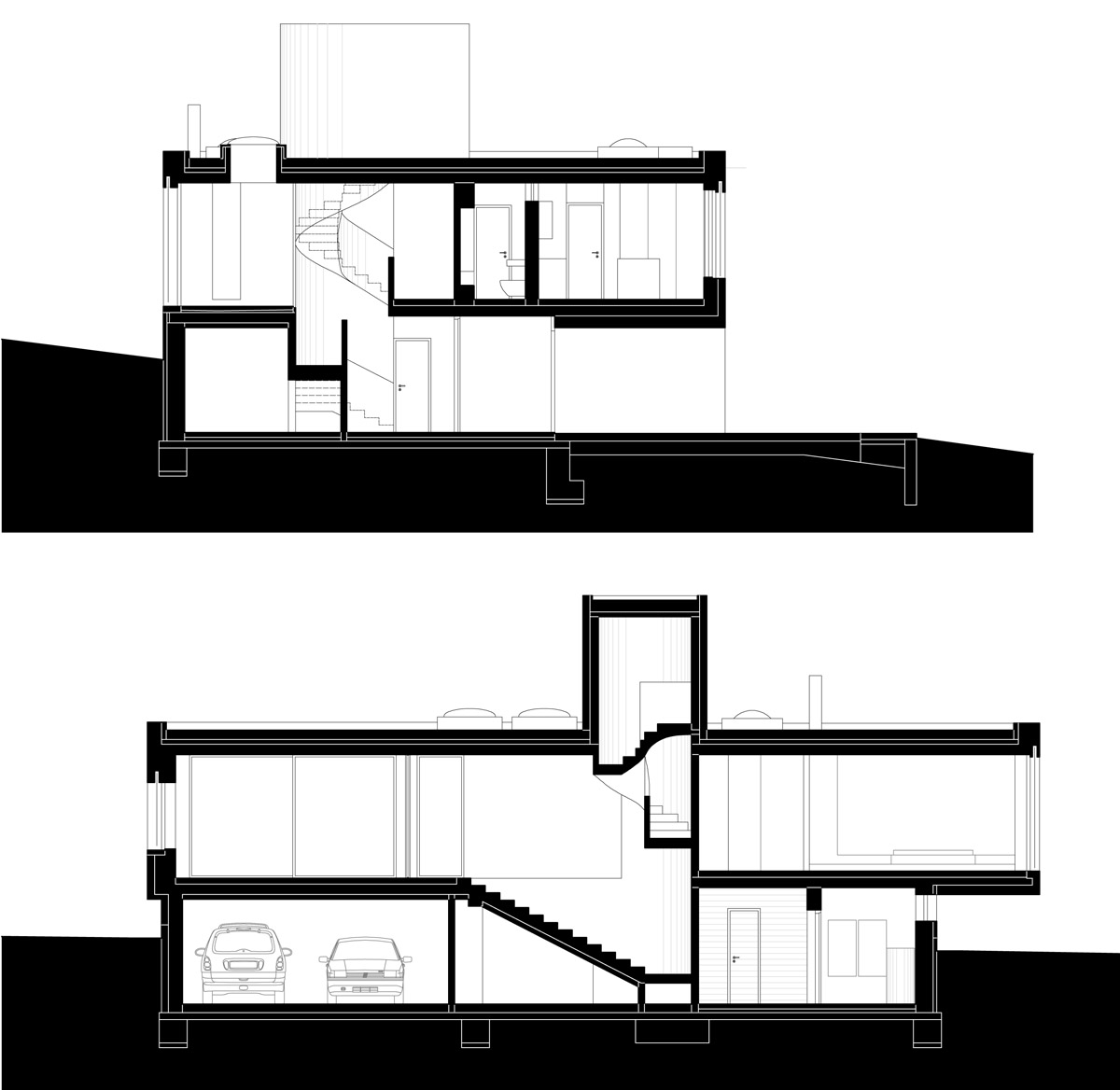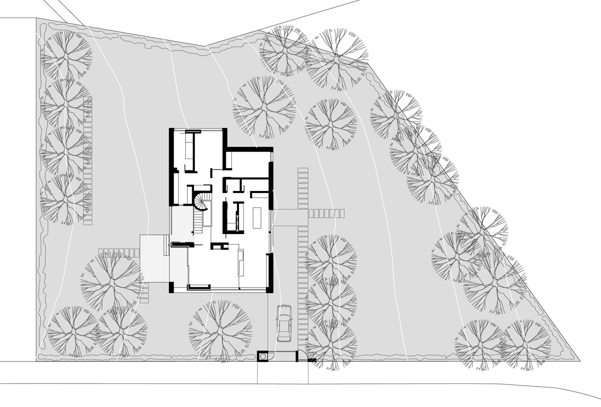 Autoři volí formu na sever a východ uzavřenou (severní část pozemku tvoří zeď domu a ochranná zeď, v severovýchodní části pozemku je garáž), dům s terasami a obytnými místnostmi je otevřen do zahrady, orientované mírně jihozápadně.