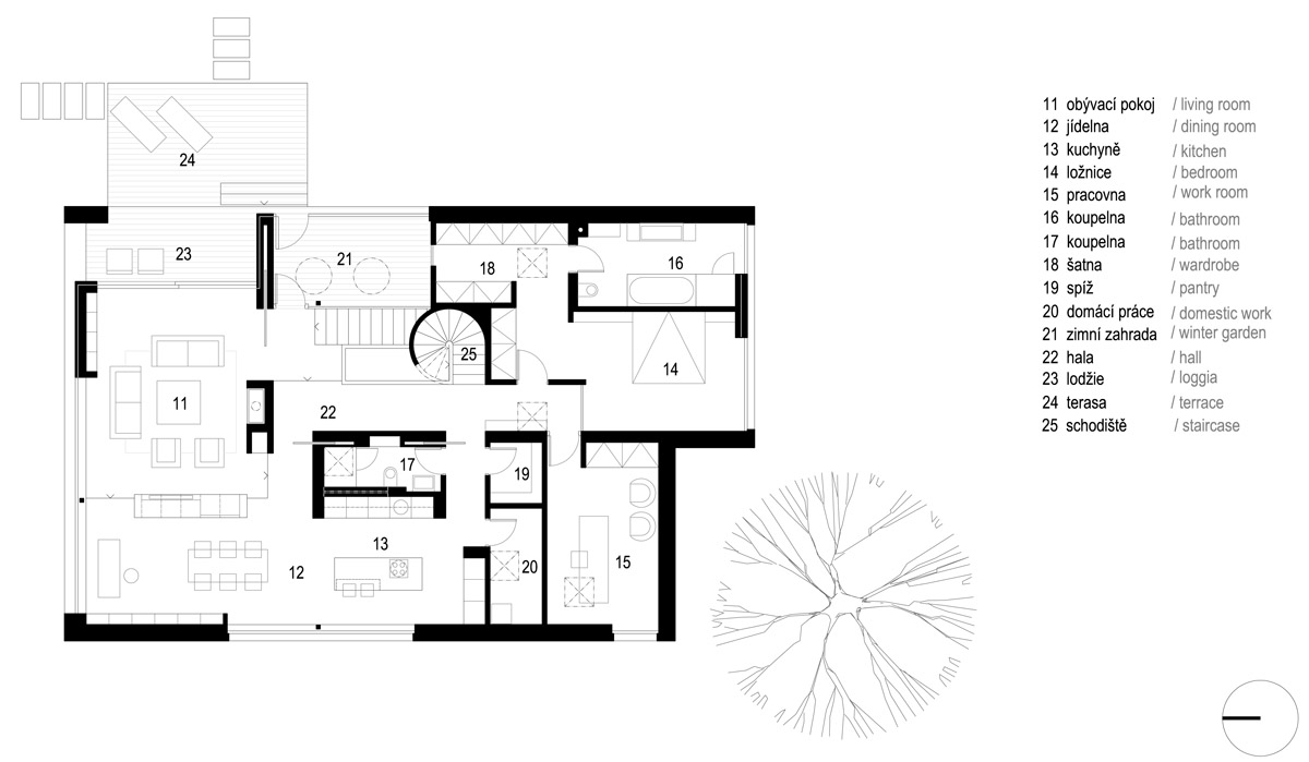 S ohledem na požadavek investora (dvougenerační RD) je 1. nadzemní podlaží navrženo pro investory a jejich děti, 2. nadzemní podlaží je určeno rodičům investorů. Obytné prostory jsou velkorysé, mezi pravou a levou částí domu se nachází nadstandardně prosklený prostor orientovaný do zahrady, vytvářející separátní odpočinkové místo v rámci prodlouženého obývacího pokoje.