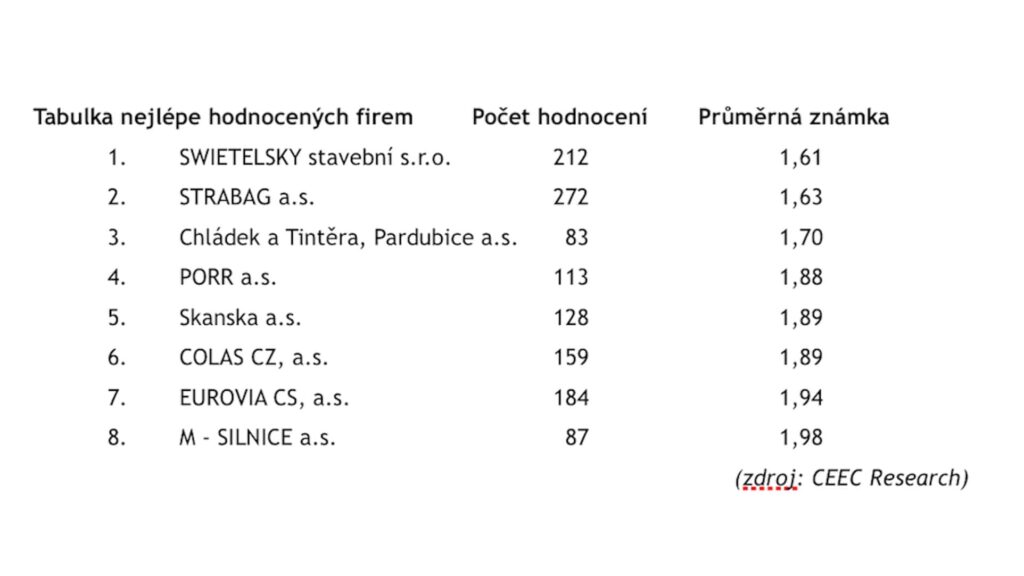 Vítězem soutěže TOP stavební společnost roku se stala společnost Switelsky stavební. Mezi oceněnými stavebními firmami jsou druhý Strabag a třetí Chládek a Tintěra Pardubice. Výsledky zpracovala analytická společnost CEEC Research na základě hodnocení několika stovek veřejných zadavatelů.