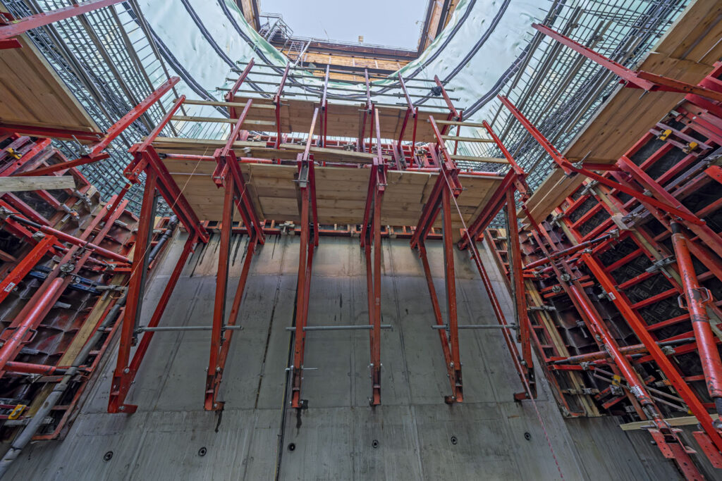 Spodní takt – zárodek – byl řešen nasazením opěrných rámů SB a rámového bednění TRIO a RUNDFLEX. Další výškové takty o výšce 3 metry byly prováděny lávkovým systémem SCS 180, kotveným do stěn kotvením DW26/M36 s připojeným bedněním TRIO a RUNDFLEX.​