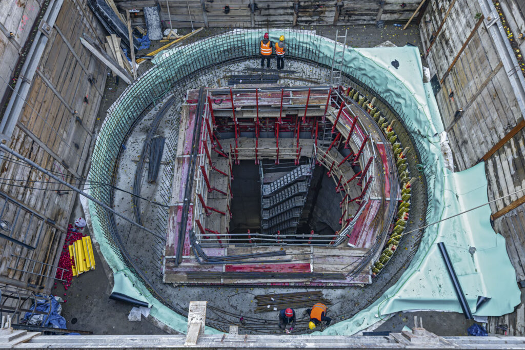 ​U této šachty bylo nutné také vytvoření podpěrné konstrukce a vrchlíku u přestupní chodby. Zde bylo na podepření nasazeno modulové lešení PERI UP Flex a díly ze stavebnice pro inženýrské stavby VARIOKIT.​