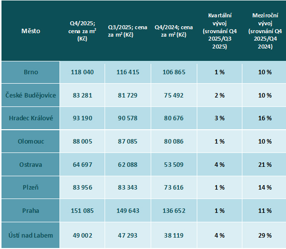 Při kvartálním srovnání se ceny starších bytů v závěru roku 2025 zvyšovaly v jednotkách procent. V Praze šlo oproti předchozímu čtvrtletí o nárůst o 1 %, v Brně také o 1 %. V Hradci Králové vzrostly ceny čtvrtletně o 3 %, v Plzni o 1 % a v Olomouci o 1 %. Výraznější krátkodobou dynamiku vykazují tradičně levnější regiony: v Ostravě se ceny mezi čtvrtletími zvýšily o 4 %, v Ústí nad Labem rovněž o 4 % a v Českých Budějovicích o 2 %. Ve všech sledovaných městech tak došlo i z kvartálního pohledu ke zdražení starších bytů.