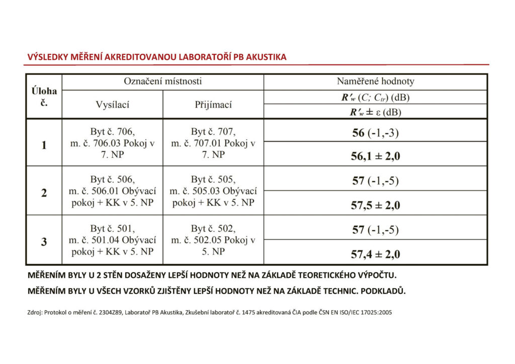 Dvě stěny dosáhly lepších hodnot, než bylo stanoveno na základě teoretického výpočtu. Třetí stěna se pak rovnala teoretickému předpokladu. Všechny tři stěny pak dosáhly lepších výsledků než výpočet podle technické dokumentace, ze které bude většina projektantů a specialistů vycházet pro své posouzení. Závěrem lze konstatovat, že všechny měřené konstrukce Rezidence Ponavia III, vyrobené z vápenopískových bloků Silka Tempo 240, splnily závazné požadavky normy s rezervou.