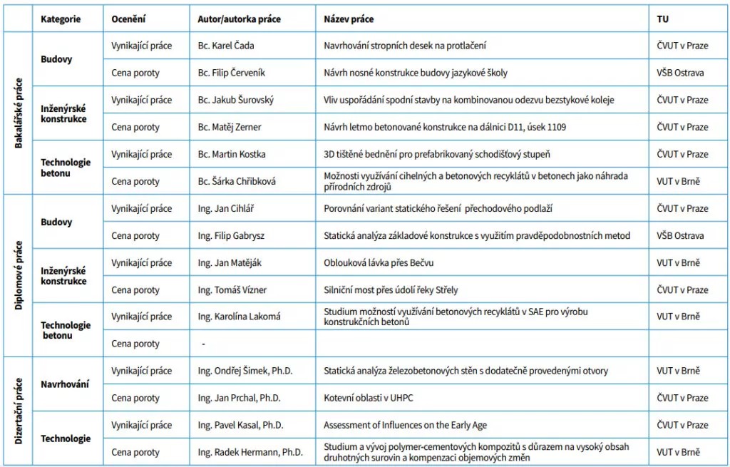 Vítězové soutěže získali nejen prestižní ocenění, ale také finanční odměnu, na kterou přispěla společnost TBG Metrostav. TBG Metrostav s hrdostí podporuje mladé odborníky v jejich kariérním rozvoji. Oceněným studentům gratulujeme a těšíme se, že se s nimi budeme setkávat i nadále v odborných betonářských kruzích!