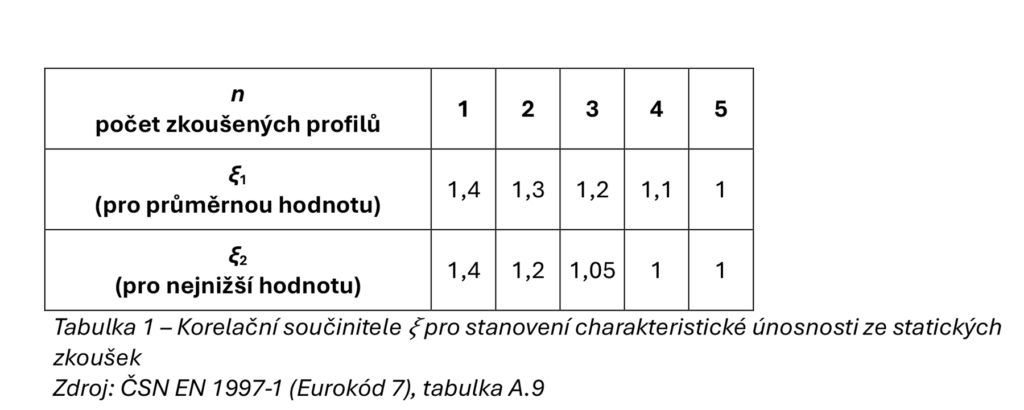 U pilot a zemních vrutů se používají korelační součinitele 𝜉 podle tabulky A.9 v příloze normy (tabulka 1). Tyto koeficienty zvyšují bezpečnostní rezervu v závislosti na počtu zkoušených míst (n). Pokud uděláte pouze 1 zkoušku, musíte naměřenou únosnost vydělit číslem 1,4 a ztratíte 40 % reálného výkonu vrutu jen díky „nejistotě“. Z toho vyplývá, že jen pouhým zvýšením počtu testů „získáte“ až téměř 30 % únosnosti navíc na každém jednom vrutu bez jakékoliv změny v konstrukci.