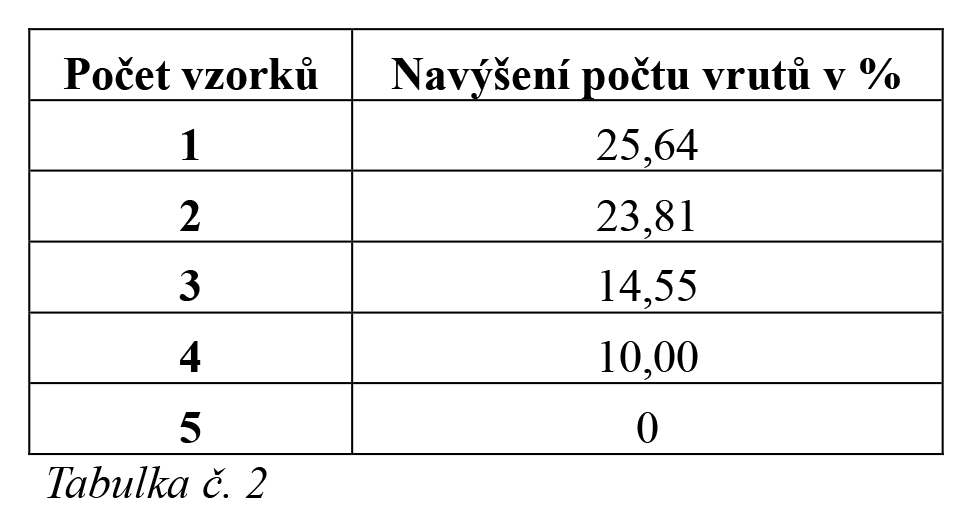 Z tabulky jednoznačně vyplývá nevýhodnost menšího počtu zkoušek, než je pět. Když dodavatel vrutů provede pouze jeden test vrutu ve vertikálním směru, je výsledná hodnota možného zatížení na vrut redukována dodatečnými koeficienty ξ1 a ξ2, kdy je nad rámec standardní bezpečnosti započtena ještě další bezpečnost vztažená k malému počtu provedených vzorků. Zákazníkovi se tím sníží výsledné zatížení vrutu a musí si pořídit o 25,64 % více vrutů.
