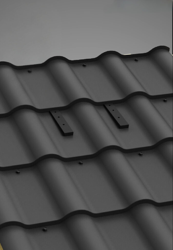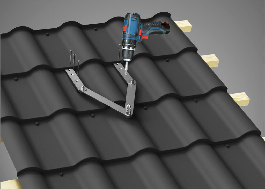 Kotvicí bod se usadí na tyto pryžové podložky a přišroubuje se přiloženými nerezovými šrouby s těsněním do podkladu. Utáhne se momentem 7 Nm. Nesmí se ovšem kotvit na poslední vlnu panelu pod hřebenem