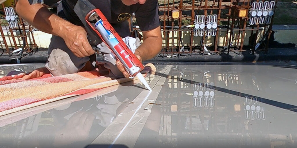 Představa investora u první betonáže byla „batikovaný beton“, který se bude co nejvíce přibližovat ve své kvalitě zpracování pohledovému betonu v hladkosti mramoru. Veškeré styky bednicích desek, stejně tak hlavičky použitých vrutů byly pečlivě zatmeleny a kontaktní plochy bednicích desek byly potaženy hladkou fólií. Spoje bednicích desek byly u první betonáže řešeny chemicky, u druhé betonáže svařením tavidlem za tepla nitrogenovým vyvíječem (stavebník si potrpí na experimenty), viz fotografie č. 2 a 3.