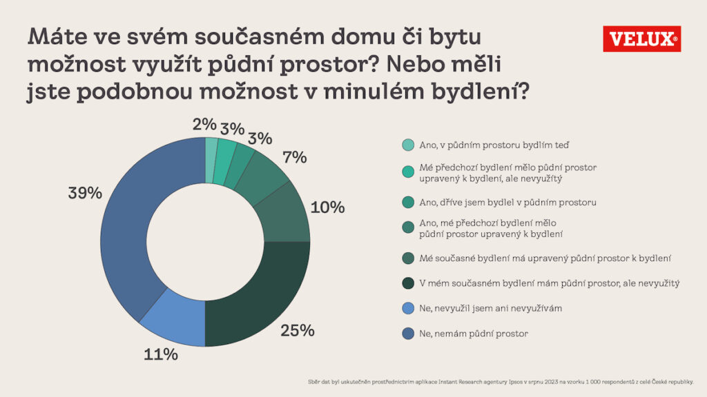 Jedním z nejjednodušších řešení současných problémů s nedostatkem bydlení může být využití půdních prostor. České domácnosti se ale zatím do využívání půdy příliš neženou, a to přesto, že půdu má k dispozici téměř třetina českých rodinných domů či bytů. Z aktuální studie společnosti VELUX vyplývá, že 25 % českých domácností má k dispozici půdní prostor, ale nevyužívá jej. Dalších 10 % pak má místo na půdě upravené k bydlení, ale nebydlí v něm. Pouhá 2 % dotázaných uvádějí, že na půdě bydlí.
