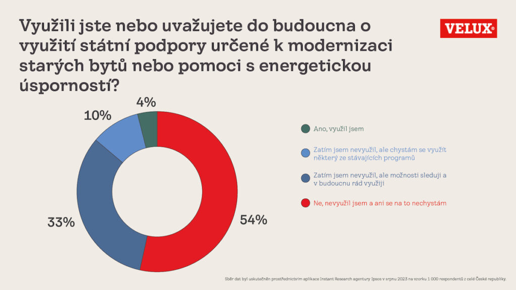 Domácnosti přitom nový program pečlivě sledují, 10 % odpovídajících připouští, že se chystá využít některý ze stávajících dotačních programů. A dalších 33 % říká, že možnosti sledují a rádi podobný program využijí v budoucnosti. Plných 54 % respondentů je naopak přesvědčeno, že žádnou podobnou možnost v budoucnu nebude chtít využít.