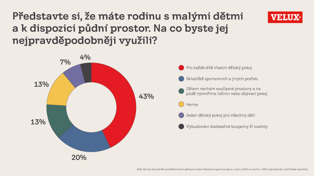 Pokud by respondenti měli malé děti a půdní prostor k dispozici, využili by jej nejčastěji právě k vybudování dětských pokojíčků. Na 43 % dotázaných by přitom vybudovalo vlastní pokoj pro každé dítě zvlášť, 7 % by postavilo jeden dětský pokoj pro všechny děti. Pro 20 % rodin s malými dětmi by byl ideální prostor jako skladiště sportovních a jiných dětských potřeb. A 13 % by dětem přenechalo současné prostory a přestěhovali se sami na půdu.