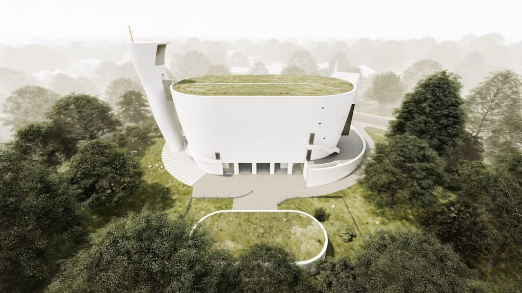 Architektonické řešení zpracoval architekt Zdeněk Fránek, držitel ocenění Architekt roku 2020 za celoživotní dílo. Samotný vstup do objektu upoutá pozornost čtyřdílným oknem, které symbolizuje čtyři evangelisty. Architektura lodi kostela připomíná archu, zatímco věž evokuje postavu, která se dotýká tajemství Boha ve světě a čase. Předobrazem je tvar gotických madon, kdy madona drží dítě, a tak se dotýká tajemství Boha i člověka. Po obvodu svatyně ve spirále stoupá bezbariérová stezka, stejně jako se ve spirále mezi zemí a nebem vyvíjí lidský život. Tato stezka se využije ke galerijním akcím a bezbariérovému přístupu k provozním místnostem určeným k setkávání.