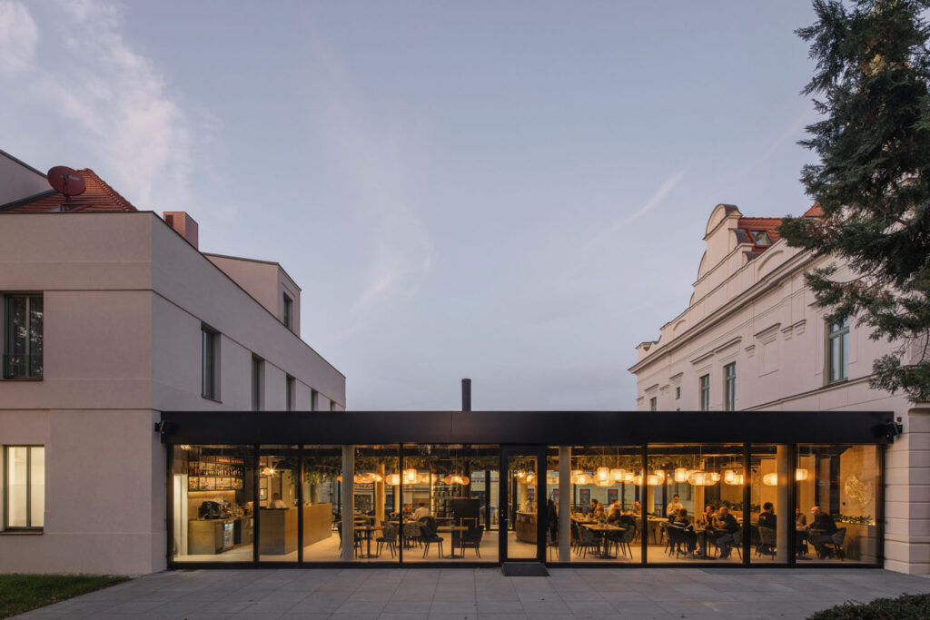 Vzhled historické budovy se přiblížil přeměně z roku 1909 od architekta Bohuslava Ryšavého. „Odstranili jsme všechny vrstvy, které vilu postupně měnily, a navázali tak na původní architekturu. Záměrem bylo zároveň zpřístupnit místo, propojit jej s městem, veřejným prostorem a jeho obyvateli. V tom nám pomohla skleněná část, která spojuje historickou budovu s novým objektem a zároveň zrcadlí svůj interiér do dlouhodobě opomíjeného parku. Díky tomu kolemjdoucí nahlíží do restaurace a naopak její návštěvníci neztratí kontakt s prostředím, ve kterém se nacházejí,“ doplňuje Nina Ratočka Pevná, spoluzakladatelka luni architekti.