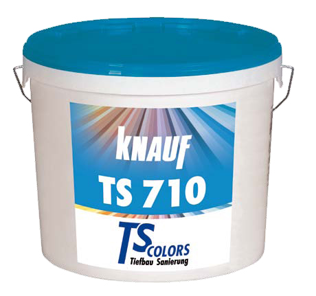 Knauf TS 710Jedná se o špičkovou silikonovou vrchní barvu určenou k finálním nátěrům betonových ploch. Barva výborně odolává UV záření a je určena do náročných podmínek a expozic ploch. Neobsahuje organická rozpouštědla a je nehořlavá.