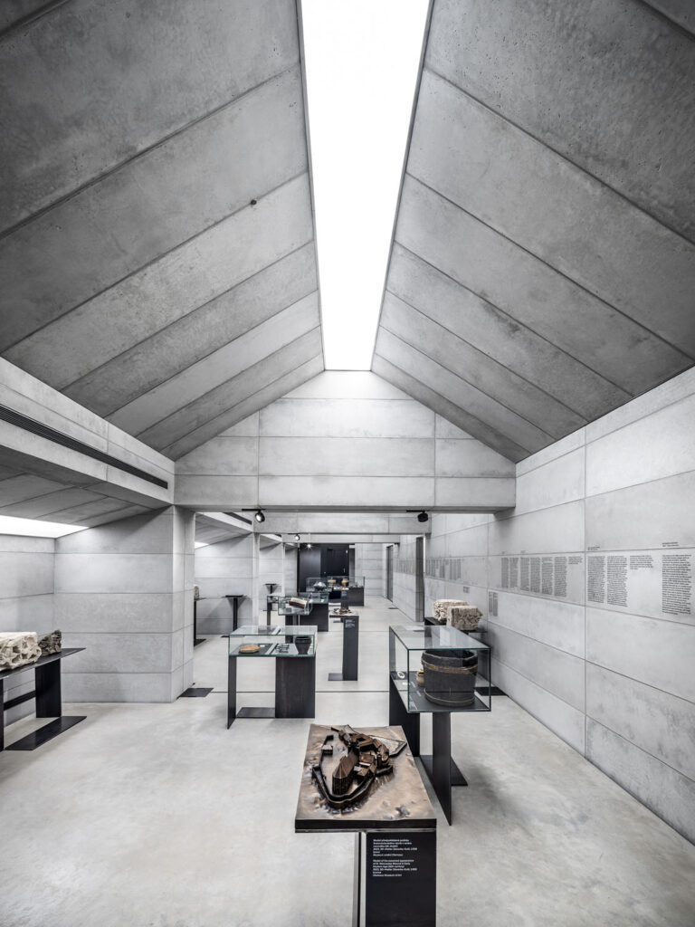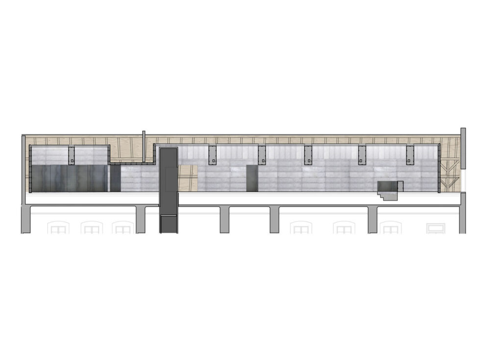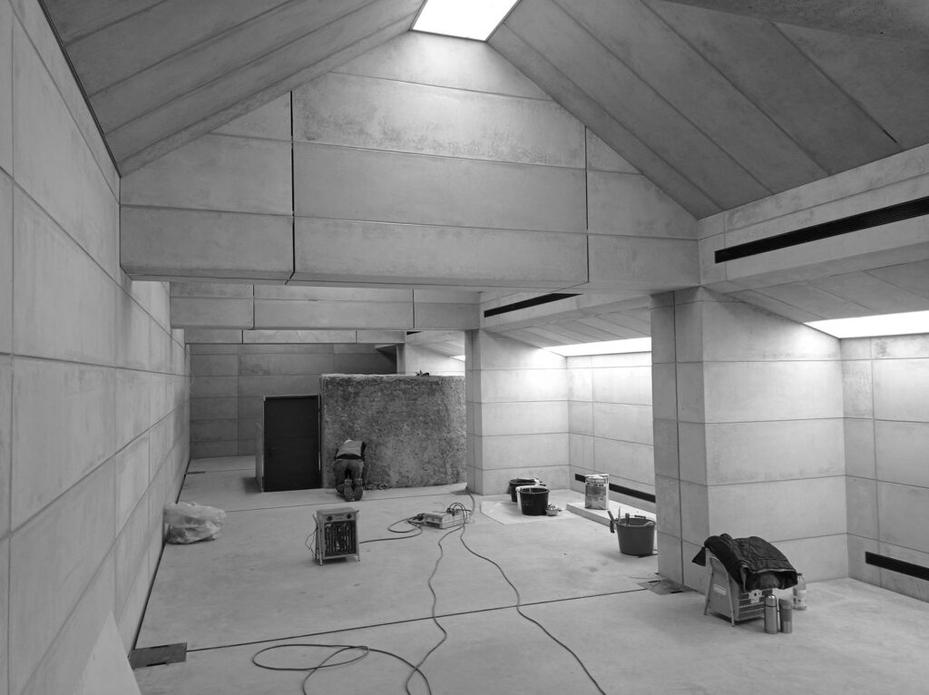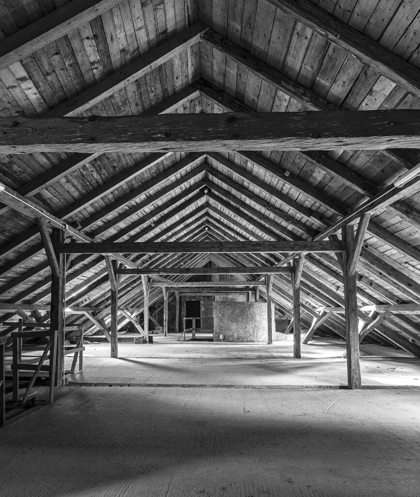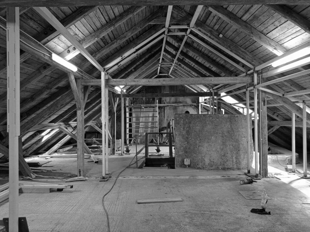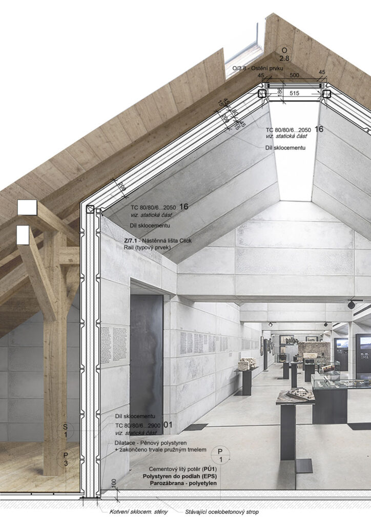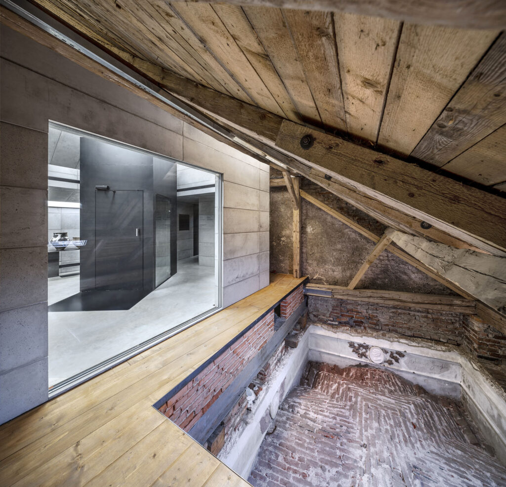 Při promýšlení návrhu jsme si kladli otázku míry zásahů do stávajícího podkroví. Nepřišlo nám vhodné izolovat dřevěné konstrukce a z toho důvodu jsme hned na začátku zamítli standardní zateplení půdního prostoru. Naše koncepce představuje maximální respekt k dochovaným konstrukcím podkroví, které ponecháváme v původním stavu, včetně krytiny. Do prostoru vkládáme nový betonový objekt s vrchním osvětlením, jenž má dostatek svislých stěn pro vystavování. Objekt přejímá geometrii zkoseného podkroví s tím, že si udržuje odstup od všech historických konstrukcí. Jedná se tedy o jakousi „matrjošku“, kdy je menší dům vsazený do většího. Vložený objekt jsme navrhovali tak, jako by byl umístěn ve venkovním prostředí. Jediné, co jsme nemuseli řešit, byla izolace proti vodě, jelikož to zajišťuje stávající střecha.