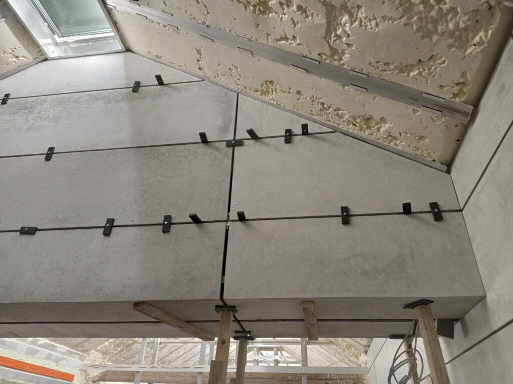 Panely v jednotném rastru s přesností na milimetr obíhají celý prostor. Prováděcí i výrobní dokumentace musela být připravena velmi pečlivě. Sál je prosvětlen řadou úzkých světlíků mezi stropními žebry, které přivádí difuzní světlo