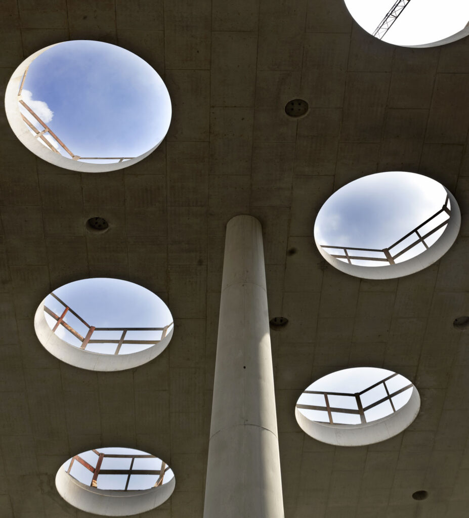 Z důvodu ekonomické optimalizace probíhala betonáž stropní desky ze dvou betonových směsí současně. Spodní povrch, boky desky a viditelné hrany otvorů pro světlíky byly betonovány světlým betonem COLORCRETE® s titanovou bělobou, zatímco nepohledové části byly vyplněny běžným šedým betonem. Celkový poměr pohledového a běžného betonu byl 60 : 40.
