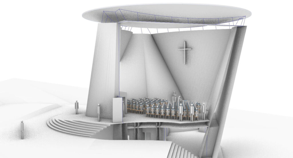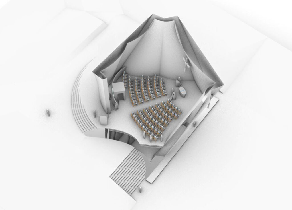 Kostel je navržen tak, aby kromě liturgických účelů vyhověl i komornímu kulturnímu využití. Z akustických důvodů má proto stavba zevnitř jiný tvar než zvenku. Vypouklé a zvuk rozptylující stěny jsou z velké části duté, což umožňuje do nich vložit tepelnou izolaci. Disk střechy se vznáší nad stěnami a prosklenou mezerou přichází do kostela světlo. Střecha není v návrhu tištěná, ale je v kombinaci ocelové a dřevěné konstrukce. Umožnila by bazilikální osvětlení hlavního prostoru ze všech směrů. Také tvar střechy přispívá akustické kvalitě prostoru.