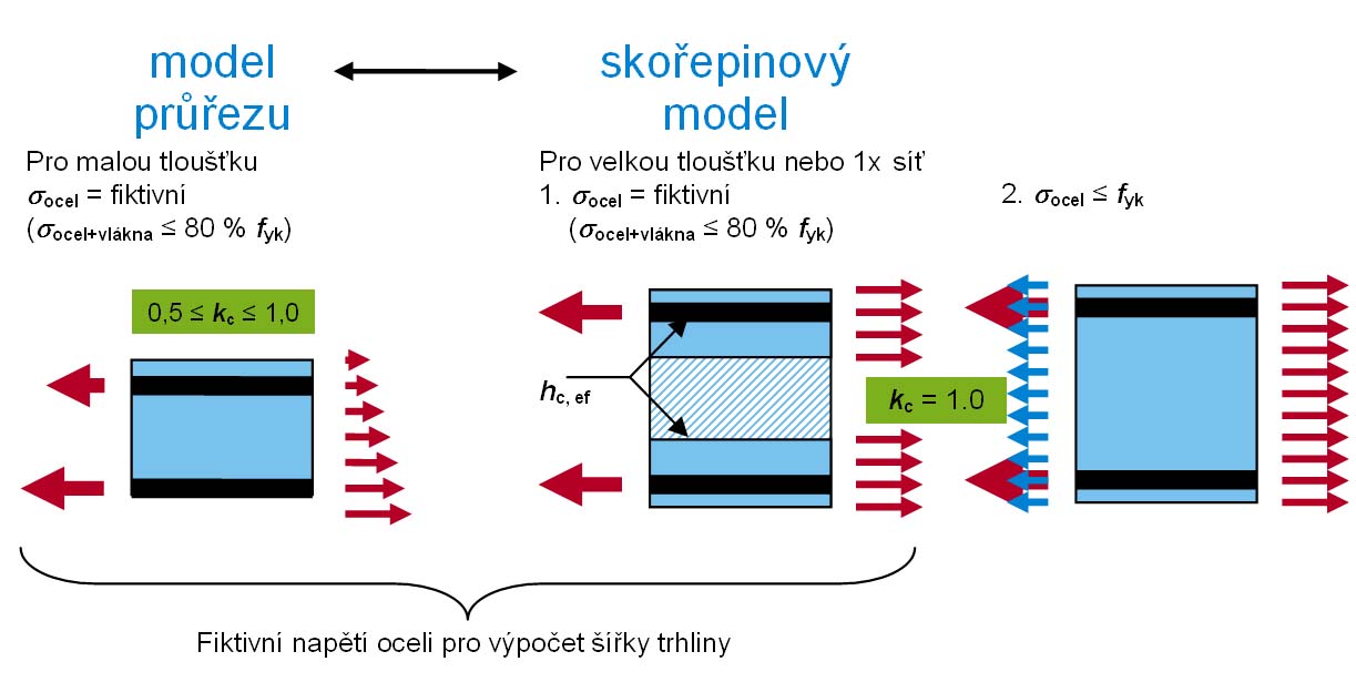 V případě desek s větší tloušťkou nebo při použití jednovrstvé výztuže by mohl rozhodovat jiný model – takzvaný skořepinový. Ten bere v úvahu pouze napětí v tahu v oblasti blízké tyčové výztuži (hc, ef). Ovšem vždy se předpokládá, že tato oblast je pod plným napětím, takže kc = 1,0 (obr. 3, uprostřed).