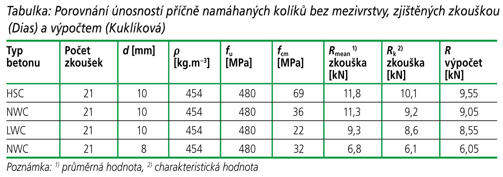 Z hodnot uvedených v tabulce vyplývá, že únosnosti kolíků zjištěné podle analyticky odvozených výpočetních vztahů (Kuklíková, 2004) se velmi dobře shodují s charakteristickými hodnotami zjištěnými zkouškou. Výpočet též velmi dobře zohledňuje změnu jakosti betonu.